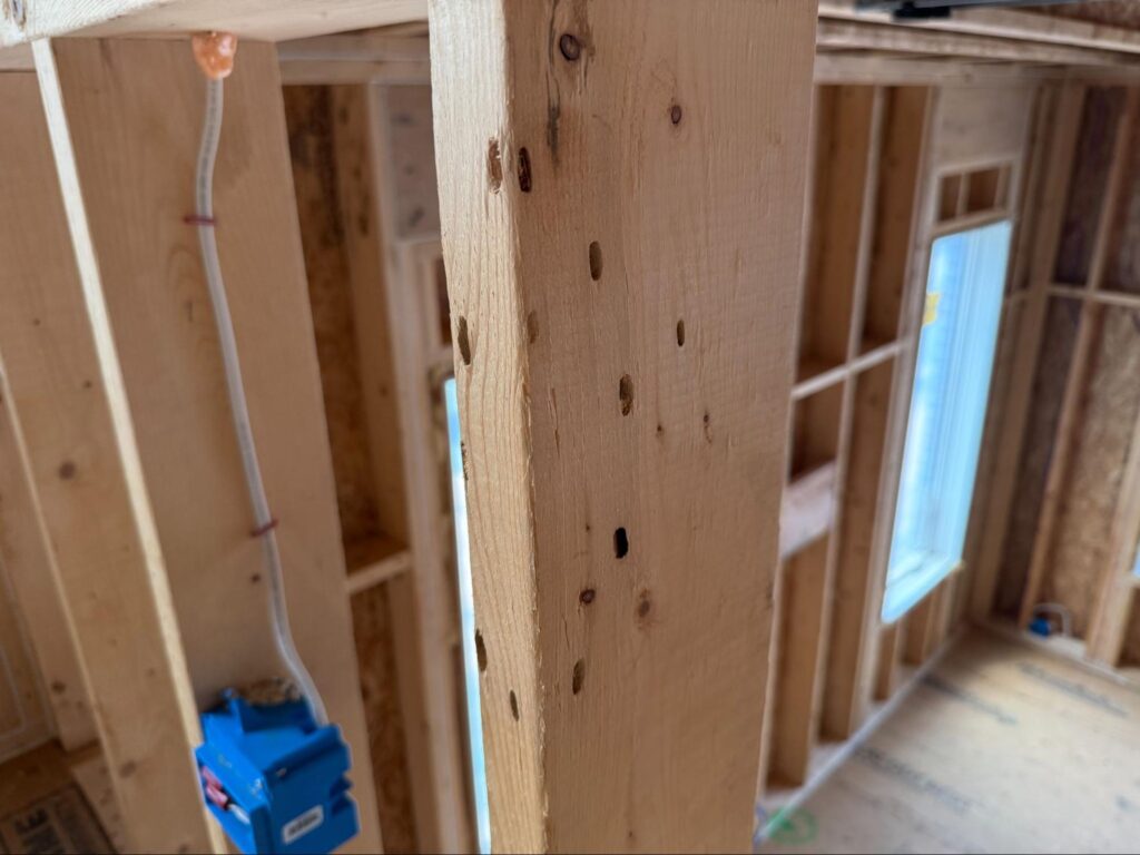 WDI activity can weaken structural wood over time and may indicate active or prior infestation that should be addressed before the home is completed.