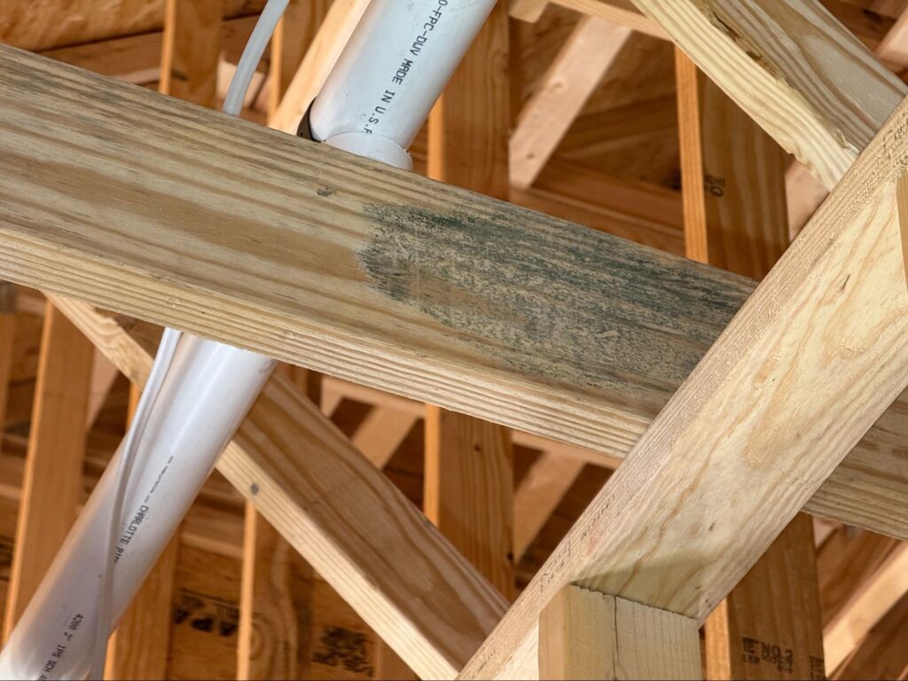 Dark staining consistent with moisture-related growth was observed on framing lumber.