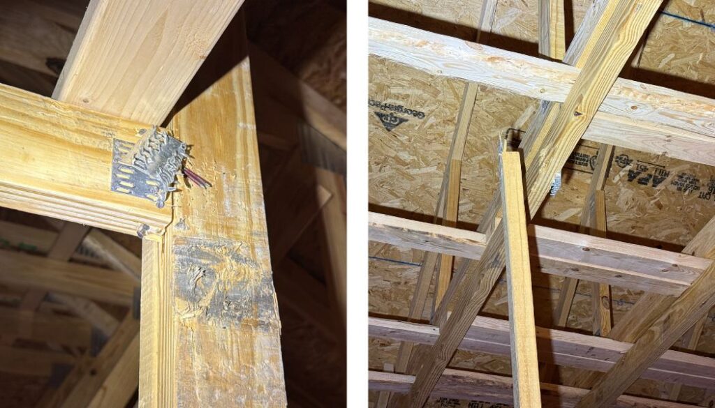 A structural framing member was damaged at a connection point, with improper fastening and compromised wood integrity.